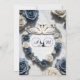 This design features a sophisticated composition of watercolor roses in shades of dusty blue and slate, accented by fresh sage eucalyptus greenery. At the center, two symmetrical white swans curve their necks to form a delicate heart shape, framed by a modern geometric diamond border. The background simulates a soft gray and white marble stone texture, layered with linear accents in a muted yellow-gold tone. The typography combines a flowing, handwritten calligraphy script with a traditional serif font for a refined finish.This is a flat printed image with a "Faux Gold" and "Printed Marble" effect. It does not contain actual metallic foil, raised textures, or natural stone materials.