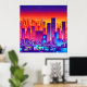 AI generated image of a synthwave/cyberpunk city with bright lights during a sunset. It's a digital concept Art with a sharp details and gradient colours.