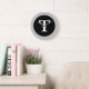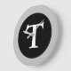 Modern custom personalized wall clock featuring your monogram initial. Shown is the letter T on a silver and black round wall clock. Initial is fully customizable. Silver background colour can be changed to match your decor. Design by WebzPickz.