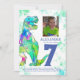 Colourful dinosaur birthday party invitation with photo template For the boy who is turning seven and loves dinosaurs. This Roaring T-Rex invites Dino fans to a fun seventh birthday party. Personalize this colourful watercolor splash blue and green 7th birthday invitation with a photo of the birthday boy or girl, the number of the birthday and the party details and you are all set for a fun packed dinosaur themed dino birthday. All dinosaur species are welcome. Unique beautiful original artwork by artist Catherine Sweetman