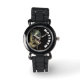 This dynamic watch design features a fierce T-Rex roaring against a sleek black background, perfect for dinosaur loving kids of all ages. The bold dinosaur image is complemented by a customizable name displayed in sharp, white block letters, adding a fun and personalized touch to the watch face. Ideal for anyone who enjoys prehistoric themes, this watch combines playful design with practicality, making it a standout accessory for daily wear. The detailed T-Rex artwork adds an adventurous vibe, perfect for showcasing your love for dinosaurs in a unique and stylish way.