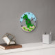 This dinosaur design wall clock is a timekeeping device designed to hang on a wall, serving as both a functional tool and a decorative focal point for a room. Made from acrylic and features a pre-installed backside hanging slot for easy hanging and a non-ticking design. You can customise this wall clock with any text of your choice. Should you require any help with customising then contact us through the link on this page. T-Rex Dinosaur design wall clock