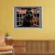 Sunset view with T-rex dinosaur, fake window scene, for a windowless office wall. Fun, realistic optical illusion scenic poster for an office or study wall.
