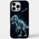 Detailed digital rendering of a luminescent blue Tyrannosaurus Rex against a dark background. The skeletal style highlights its energy display