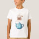A delightful and energetic cartoon illustration featuring a round, baby-blue teapot decorated with classic white polka dots. Billowing from the spout is a magical swirl of steam that lifts up a cheerful anthropomorphic tea bag. The tea bag character is bursting with excitement, displaying large, sparkling anime-style eyes, blushing cheeks, and a wide open smile, surrounded by twinkling stars in a display of pure morning joy.