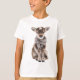 A heartwarming digital illustration of a fluffy baby calf sitting gracefully against a clean, neutral background. The calf features soft, multi-toned brown and white fur with a realistic texture, complemented by large, soulful dark eyes that create an endearing expression. It is bundled up in a thick, textured grey knitted scarf wrapped warmly around its neck, dusted with delicate, shimmering snowflakes. The art style blends painterly realism with a charming, cozy aesthetic, capturing every fine detail of the animal's gentle features and the soft fibers of the winter accessory.