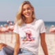 T-Shirt à manches courtes côtier Cowgirl. © Tee - shirt & Sweats at Zazzle. Un tee à manches courtes avec une paire de roses, AI généré Cowgirl Boots et un Casquette Cowgirl sur lui, à la plage. Il y a aussi le libellé Coastal Cowgirl dessus.