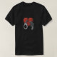 Cette conception de t-shirt d'inspiration vintage est composée d'une simple menotte, d'une arme de poing classique et d'un coeur rouge saignant, le tout représenté dans une illustration élégante en noir et blanc. L'oeuvre est dirigée contre un arrière - plan dramatique qui s'évanouit d'un gris foncé à une ombre claire, créant un sentiment de mystère et d'intrigue.