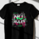 Voici un design de streetwear audacieux et pointu avec l'expression "No Rules" en style graffiti avec des plaques de peinture vert néon et rose chaud. Les effets arrière - plans et paillettes de béton foncé lui donnent une ambiance rebelle et chaotique, parfaite pour les produits de la chaussure ! 💥 🛹 👕