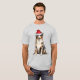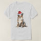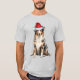 Un tricolore Australian Shepherd est assis avec un chapeau de Père Noël rouge mignon prêt pour tous les amateurs de chien ou d'animal de compagnie qui adorent la race australienne.