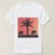 Ce T-shirt blanc est conçu avec ma représentation de deux éléphants et une silhouette de palmier contre un coucher de soleil orange.