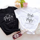 T-shirt de la soirée "The Party" dans un script chic avec un coeur et "Charleston, SC" dans une typographie moderne simple. Vous pouvez changer la destination de la fête et la couleur du t-shirt. Un t-shirt coordonné "Femme du Parti" est disponible pour la mariée.