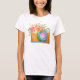 Un t-shirt avec une aquarelle illustrant une caméra orange et un bouquet floral posé sur le dessus. Les fleurs du bouquet sont rose clair et orange avec des feuilles verts, un joli arrangement floral.