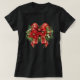 T-shirt avec un arc de Noël festif en rouge et or. Entourée de fleurs de poinsettia, de décorations de pin et de Noël.