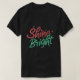 "Shine Bright" est un design probable qui met l'expression en évidence sur le t-shirt. Il peut être dans une police audacieuse et attrayante ou décoré avec divers éléments graphiques. Les couleurs utilisées pourraient être vives et gaies, reflétant le message optimiste du texte. Le placement de la phrase peut être centré sur la poitrine ou sur les épaules.