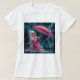 Une figure fantomatique en robe rose coule un parapluie rose vif, debout sous la pluie, tandis que la foudre fissure le ciel au-dessus d'une ville ombragée.