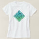 Un t-shirt blanc avec un noeud bleu-vert celtique avec bordure, dans un design en forme de losange.