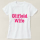 Chemise blanche élégante qui dit femme Oilfield en police rose cool. Le dos de la chemise dit obtenir d'une semaine à la fois et a le derrick à l'huile.