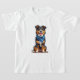 Chien gai assis debout, montrant une expression amicale avec sa langue dehors. Il a un manteau principalement noir avec des marques distinctes orange et blanc sur le visage, la poitrine et les jambes. Le chien porte un bandana bleu plaid autour du cou, ce qui ajoute une touche de style à son apparence. L'arrière - plan est blanc clair, mettant l'accent sur les couleurs vives du chien et son comportement joyeux.