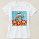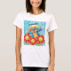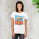 Un joyeux clown parmi les fleurs jaunes aux visages. Ce design semble vraiment efficace sur ce T-shirt féminin