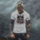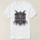 Un tee-shirt de style gothique sombre avec un grand crâne de chèvre avec un crâne humain de chaque côté. Il y a un pentagramme en bas et du sang qui coule de toute l'image.