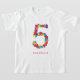 T-shirt personnalisé pour un anniversaire de 5 ans ! Doté du nom d'un enfant et d'un "5" en confetti, avec des cercles colorés de confettis arc-en-ciel.
