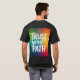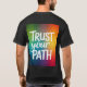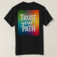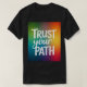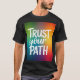 Le design des t-shirts présente un motif abstrait vibrant dans un arc-en-ciel de couleurs, superposé sur un arrière - plan flou. L'expression "Faites confiance à votre chemin" est affichée en caractères gras et manuscrits, créant une composition visuellement frappante et édifiante. Le design encourage les individus à croire en leur voyage et à suivre leur intuition.