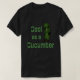 Concombre vert drôle debout avec les bras pliés et un sourire rasé sur le visage. Il porte un gilet noir, des bottes brunes et des teintes noires. Sur le côté et en dessous, il y a les mots "Cool as a Cucumber" en lettres vertes.