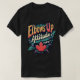 L'image montre un design de t-shirt avec l'expression "Elbows Up Attitude First" dans une police audacieuse et rétro. Le texte est organisé dynamiquement, avec "Elbows Up" dans une grande police de dégradé de style 3D jaune à orange avec un contour noir, tandis que "Attitude" est dans une police crème légèrement incurvée en dessous. "First" est placé à l'intérieur d'une bannière sombre près du fond. L'arrière - plan comprend un motif énergique à l'explosion, aux formes turquoises, noires et violettes irradiées vers l'extérieur, ajoutant un sentiment de mouvement. Au fond du dessin, il y a une grande feuille d'érable rouge, qui suggère un lien avec le Canada. L'esthétique générale est vibrante, avec un mélange de tons chauds et cool, ce qui lui donne une ambiance rétro audacieuse et dynamique.