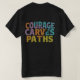 Le design du t-shirt comporte l'expression "Courage Carves Paths" en caractères gras et multicolores. Les couleurs vives et la police dynamique créent une déclaration visuellement frappante et inspirante. La conception transmet un message de persévérance, de détermination et de puissance du courage pour surmonter les défis et créer de nouvelles opportunités.