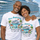 Tropical cruise anniversary design featuring a ship, palm trees, and floral accents. Personalized anniversary cruise shirt with names and date for a romantic celebration.