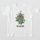 This personalized boys' t-shirt features a cheerful, green dinosaur knight standing in full medieval armor, complete with a helmet, breastplate, shield and sword.