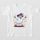 This adorable Halloween T-shirt features a cheerful cartoon ghost wearing black-rimmed glasses and a purple witch hat with an orange band. The ghost floats happily while holding two colorful striped balls, surrounded by pumpkins and bright festive starbursts. Perfect for kids who love cute and friendly Halloween designs, this shirt adds fun to any trick-or-treat adventure or seasonal party!