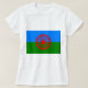 Ce dessin est orné du drapeau romani, qui est le drapeau international du peuple romani. Le drapeau est constitué d'un arrière - plan de bleu et de vert, représentant respectivement les cieux et la terre ; il contient également un chakra rouge à 16 branches, ou carrousel, au centre, qui représente la tradition itinérante du peuple romani et est aussi un hommage au drapeau de l'Inde. Le drapeau a été approuvé par les représentants de diverses communautés roms lors du premier Congrès mondial des Roms (WRC), qui s'est tenu à Orpington en 1971.