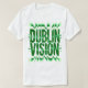 DUBLIN over VISION stands stacked in deep green, ranging from dark-emerald to a warm off-white field. The letters ripple and fracture like heat-shimmer, stretching into jagged rays and kaleidoscopic-like shards that pulse with retro-psychedelic energy.
