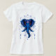 Cette image saisissante représente la tête d'un éléphant, ornée de motifs et de symboles géométriques complexes. Les yeux de l'éléphant brillent d'une lumière bleue vibrante, et son tronc est élevé dans un geste de révérence. La palette de couleurs globale est une combinaison de bleu, rouge et noir, créant un contraste saisissant. L'image est encadrée par un design géométrique complexe, suggérant une connexion spirituelle ou mystique.