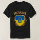 Le drapeau national et les armoiries de l'Ukraine sont infusées dans une fausse forme de bouclier doré qui, à son tour, repose sur deux faux bras feuille de laurier.