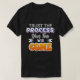 Ce t-shirt noir comporte le message encourageant "FAITES CONFIANCE AU PROCESSUS Votre temps viendra" dans une combinaison de blanc, bleu avec un contour blanc, et orange avec une police de contour blanc. Les mots sont empilés et stylisés pour créer un design visuellement attrayant et motivant.
