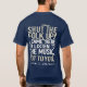 Un T-shirt foncé avec un but pratique : Faites la personne s'asseyant derrière vous pour garder la tranquillité pendant les concerts. Voulez-vous vraiment savoir où ils ont mangé le dîner ? Ou si détestent-ils leur travail ? Et devons-nous écouter leurs conversations de téléphone portable avec leur dermatologue ? Trouveront-ils jamais une solution à leur démanger ? Cette chemise peut aider.