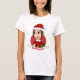 T-shirt femme avec l'illustration d'une jolie fille souriante et souriante aux cheveux longs et marron, elle porte un costume de Père Noël rouge et blanc et tient un cadeau; avec le texte modifiable modèle pour votre nom ou message, conception de vacances de Noël avec un arrière - plan rouge