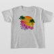 Fille de surfer avec le panneau de surf, les palmiers, le coucher du soleil, et les fleurs de ketmie.