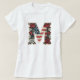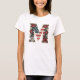 This initial 'M' is special for its rustic blend of patriotism and natural beauty. The bold letter form is filled with a cracked, vintage American flag pattern, symbolizing classic, weathered Americana. It is richly adorned with a layered display of vibrant red roses, white daisies, and patriotic red hearts. This highly detailed graphic is ideal for personalized patriotic apparel, family name initials, or vintage folk art prints.