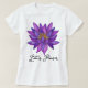 Le t-shirt présente une fleur de lotus violet audacieuse avec des étamines jaunes au centre. Sous la fleur, il y a un texte qui se lit actuellement "Fleur de Lotus" dans une police cursive décorative. Ce texte est personnalisable, ce qui signifie qu'il peut être modifié à n'importe quel libellé, expression ou nom de votre choix pour personnaliser le design.
