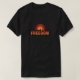 Cercle de soleil audacieux sur une silhouette de forêt noire ; gradient de feu et typographie rétro véhiculent liberté et nature sauvage.