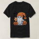 Un t-shirt avec un joli fantôme dans un beanie orange porte un verre de jus d'orange tout en se tenant à côté de deux lanternes jack-o' souriantes. Les chauves-souris et les minuscules coeurs flottent dans l'arrière - plan, créant une ambiance d'Halloween ludique.