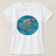 Un grand requin blanc dans l’eau montre ses dents. Ce design semble vraiment efficace sur ce T-shirt féminin