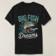 Ce t-shirt noir est l'illustration éclatante d'un grand poisson qui saute des eaux bleues et blanches. Les mots "BIG FISH" sont imprimés dans une grande police stylisée avec un dégradé de bleu et de vert en haut. Le mot "plus gros" est dans une police blanche plus petite et cursive, et "Dreams" est dans un script blanc plus large et fluide en bas. Cette conception transmet un message d'ambition et de poursuite de grandes aspirations, probablement avec un thème de pêche.