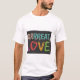 Le t-shirt comporte l'expression "Grand Amour" dans un design multicolore ludique. Chaque lettre éclate avec une teinte vibrante différente, créant un sentiment d'amusement et d'énergie. Les "Rs" sont les vedettes du spectacle, avec une police audacieuse, légèrement décalée qui met l'accent sur le grogne ludique dans "Grrrreat".