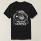 Illustration monochrome du Père Noël comme une rock star rebelle, portant une veste en cuir clouté et des lunettes de soleil, avec l'expression audacieuse "HO HUSTLE" affichée en haut de la page dans des lettres à contraste élevé,