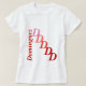 Last name in red runs up right side of shirt. To the right are large Capital letters of the First initial of the name, in various shades from pink to deep red. Personalize with your name and initial.